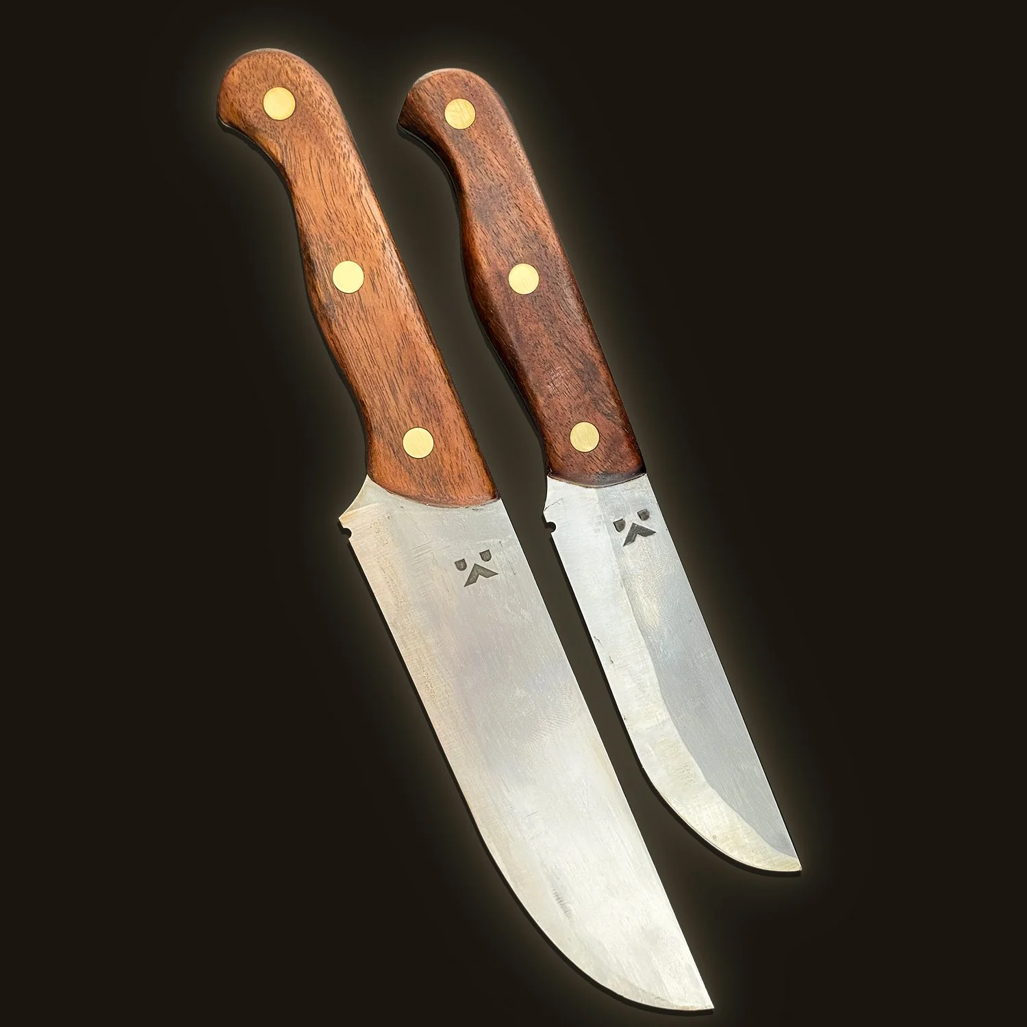 Set of two handmade stainless steel kitchen knives: 6” utility knife, 8” chef’s knife (shown with walnut handles)
